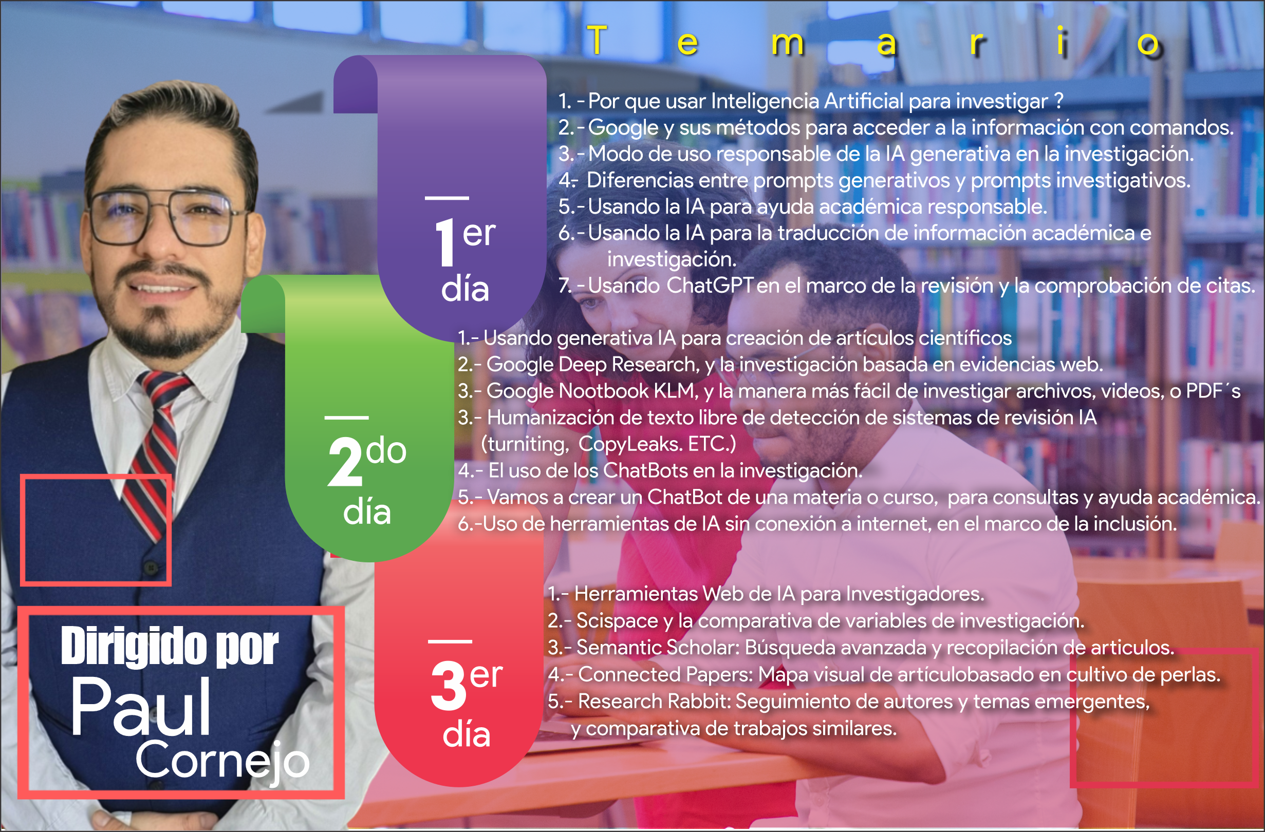Este programa de 3 días ha sido diseñado especialmente para educadores, brindándote herramientas prácticas para integrar la IA en tu labor académica, optimizar tus proyectos de investigación y abrir nuevas oportunidades en la era digital.